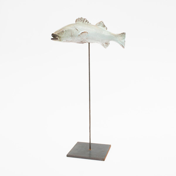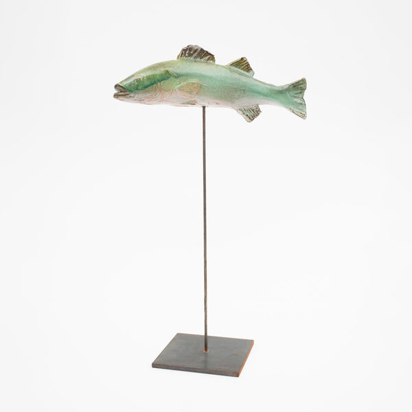 The octopus, a symbol of renewal, adaptability, and intelligence, is part of our pantheon of zoomorphic deities, seated on an adjustable iron base. The sea bass, part of the "Aquarium Table Group," is a ceramic fish modeled and enamelled to capture marine chromatic effects with unique elegance, also perched on an adjustable iron base.