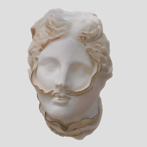 This work reflects on modern man, his experiences, and fragile balances, symbolized through the scratched and layered surface on a face of timeless beauty. It explores the intersection of imperfection and enduring elegance, capturing the complexity of human existence.