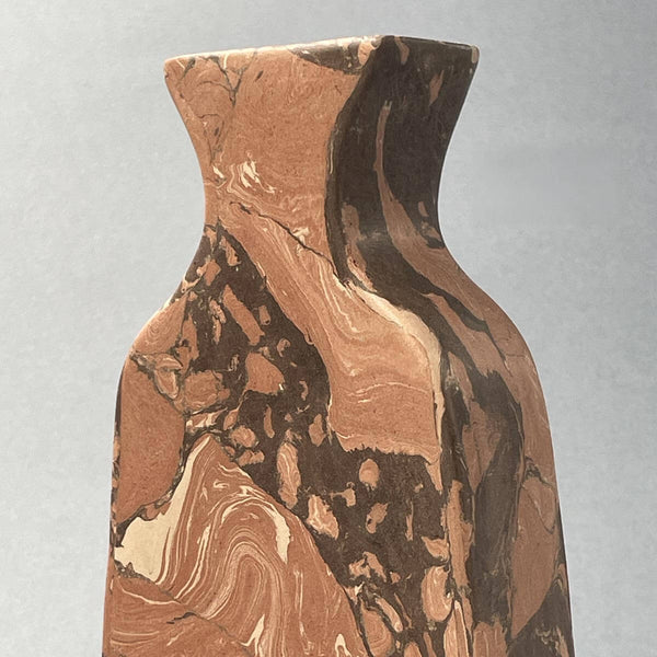 White earthenware vase crafted using the slab technique. The handmade clay mixture incorporates raw powdered pigments, blended following a specific process to achieve a marbled effect. This effect is not created with surface paints or glazes but results from combining different clay tones during the mixing process.