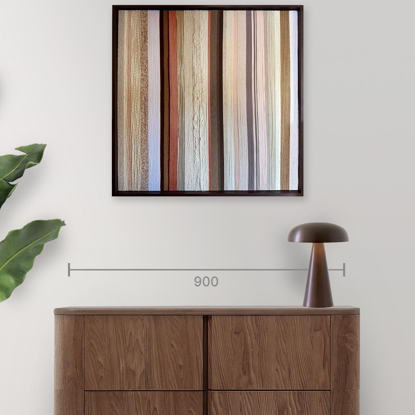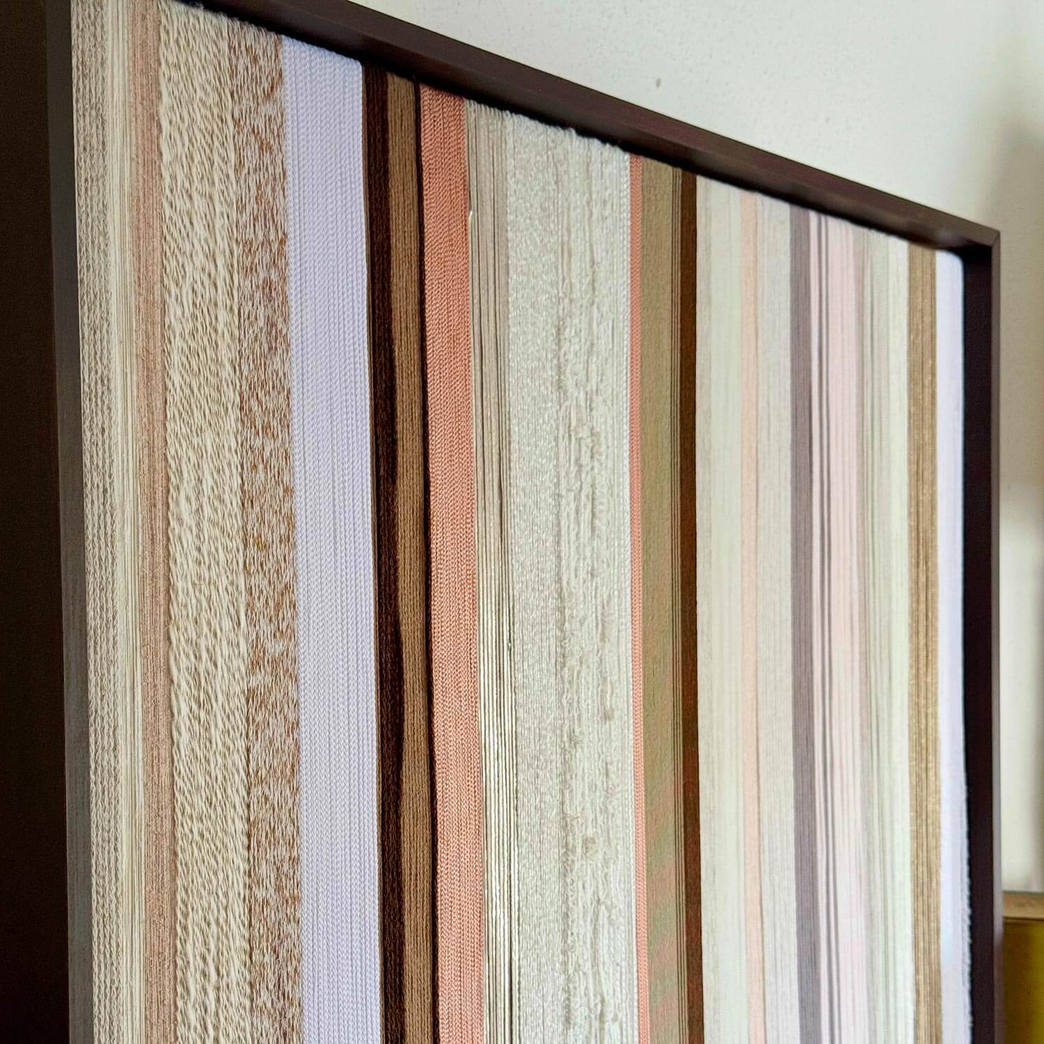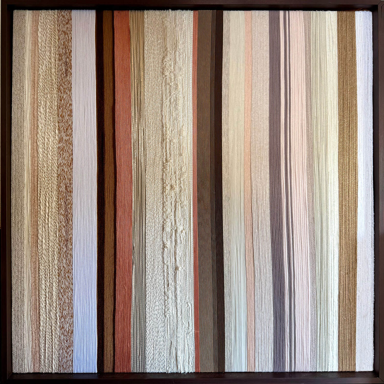 A textile artwork crafted from cotton, wool, viscose, and synthetic fibres. This piece explores the interplay of texture and tone through layered weaves and natural hues, celebrating the tactile richness of fabric and the artistry of material composition.