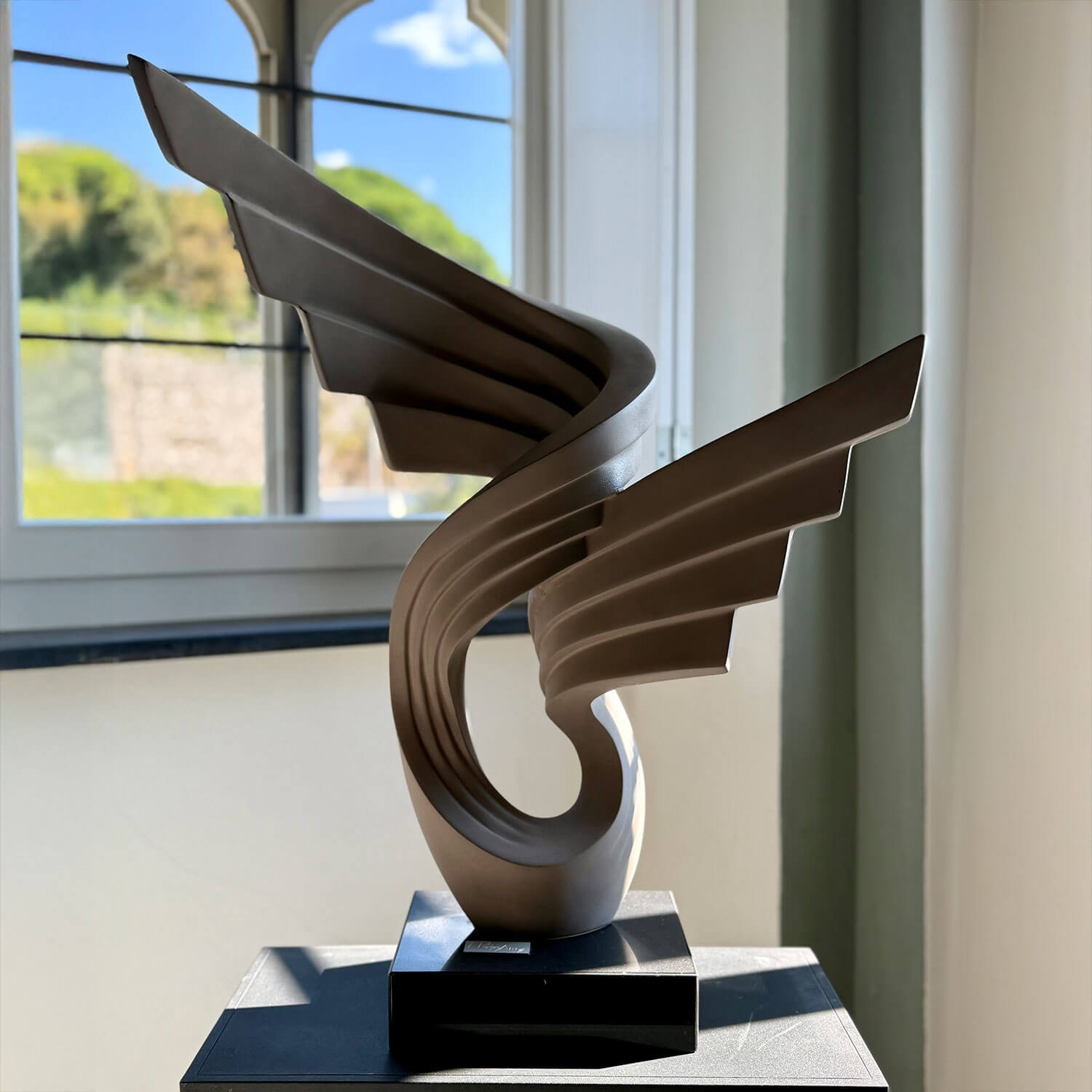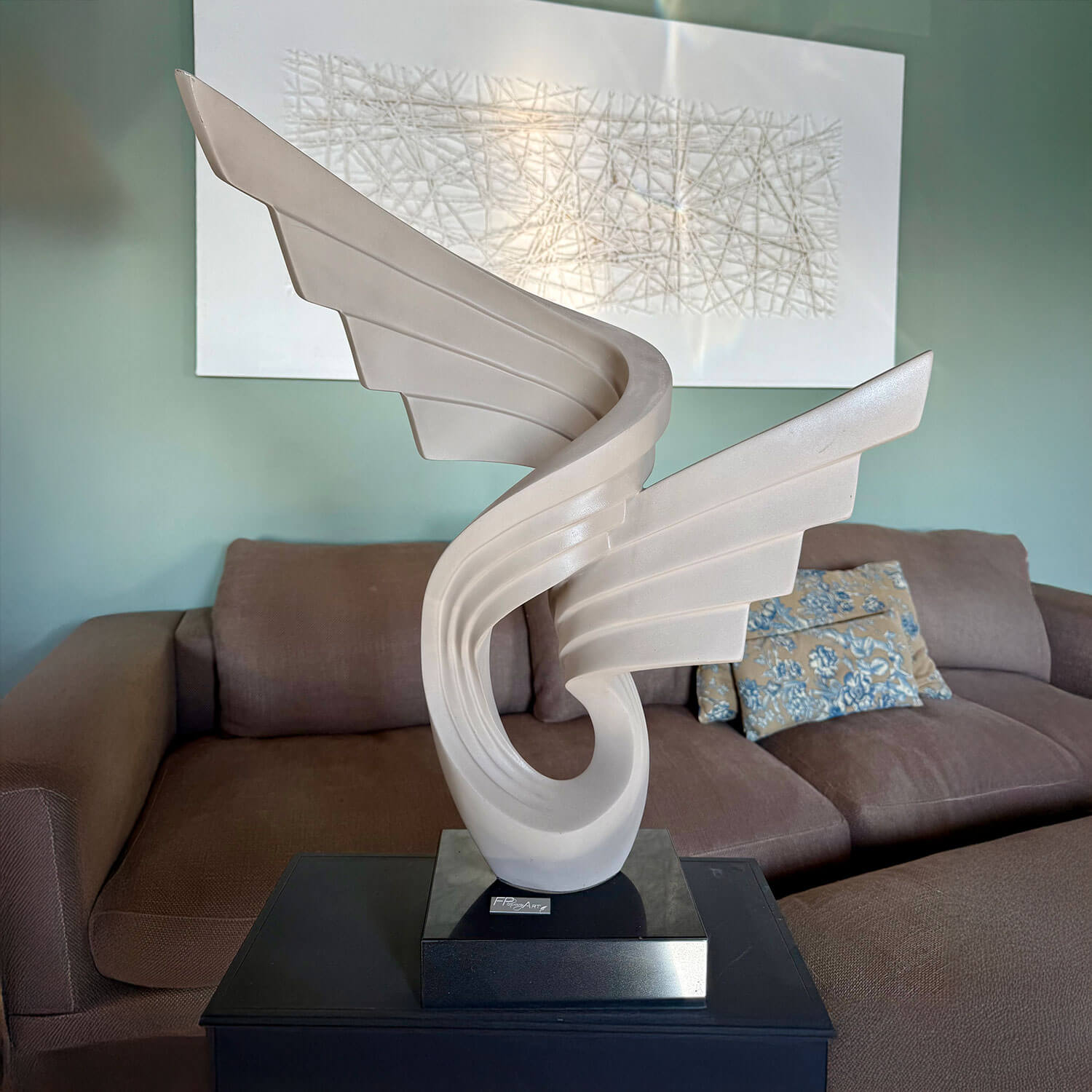 “Wings” is a contemporary sculpture crafted from resin, featuring two sweeping, wing-like forms that curve upward in a dynamic spiral. Its smooth surface and clean geometry emphasize balance, motion, and lightness. The piece explores themes of elevation and transformation, combining modern design with a sense of fluid movement.