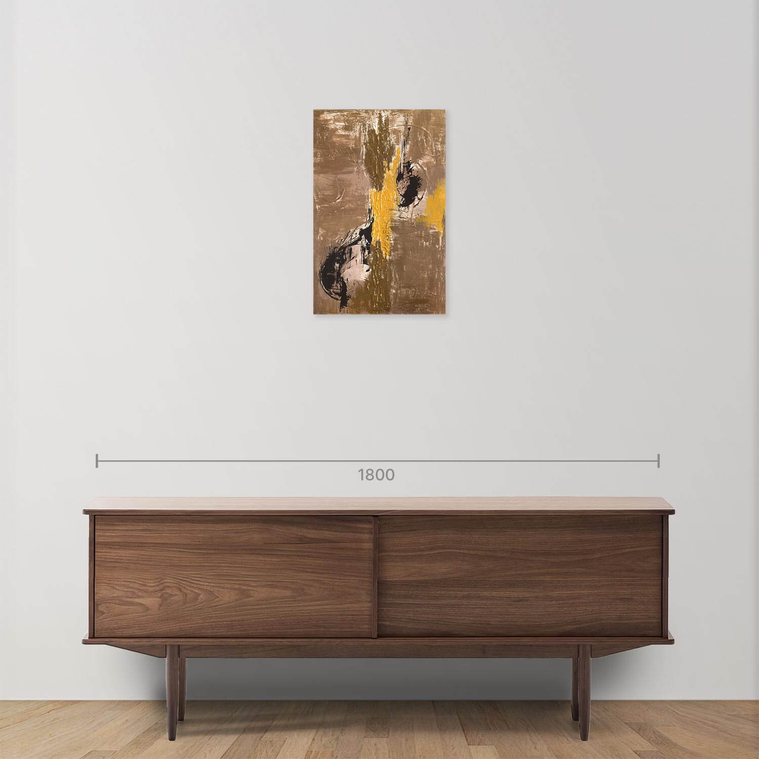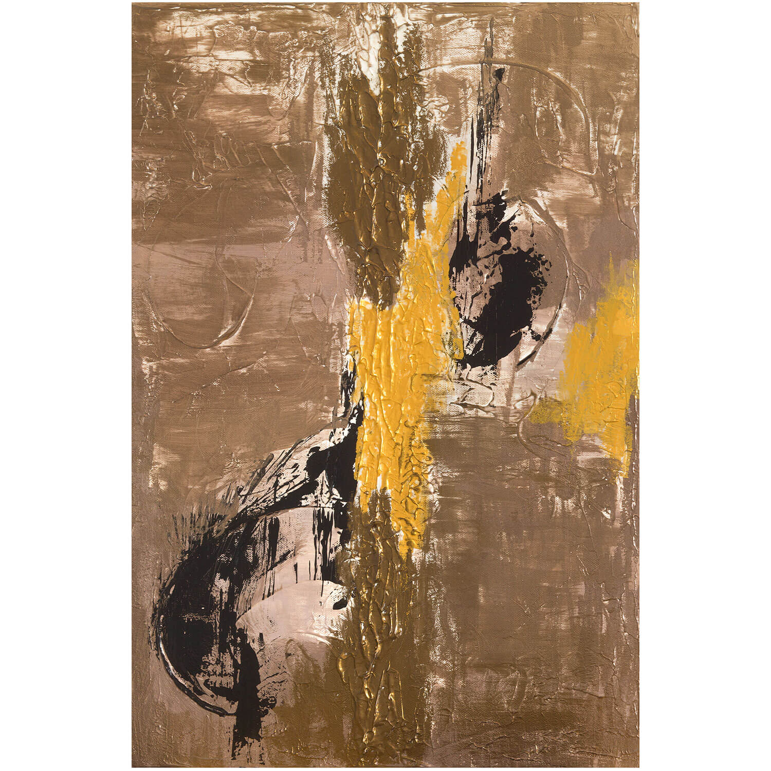 The scratching, violent pictorial gesture expresses the soul’s inner turmoil through the vibrant protest of color. Applied over a base of mortar, the acrylic tones—black, bronze, and gold—emerge in powerful contrast, enclosed within a black frame.