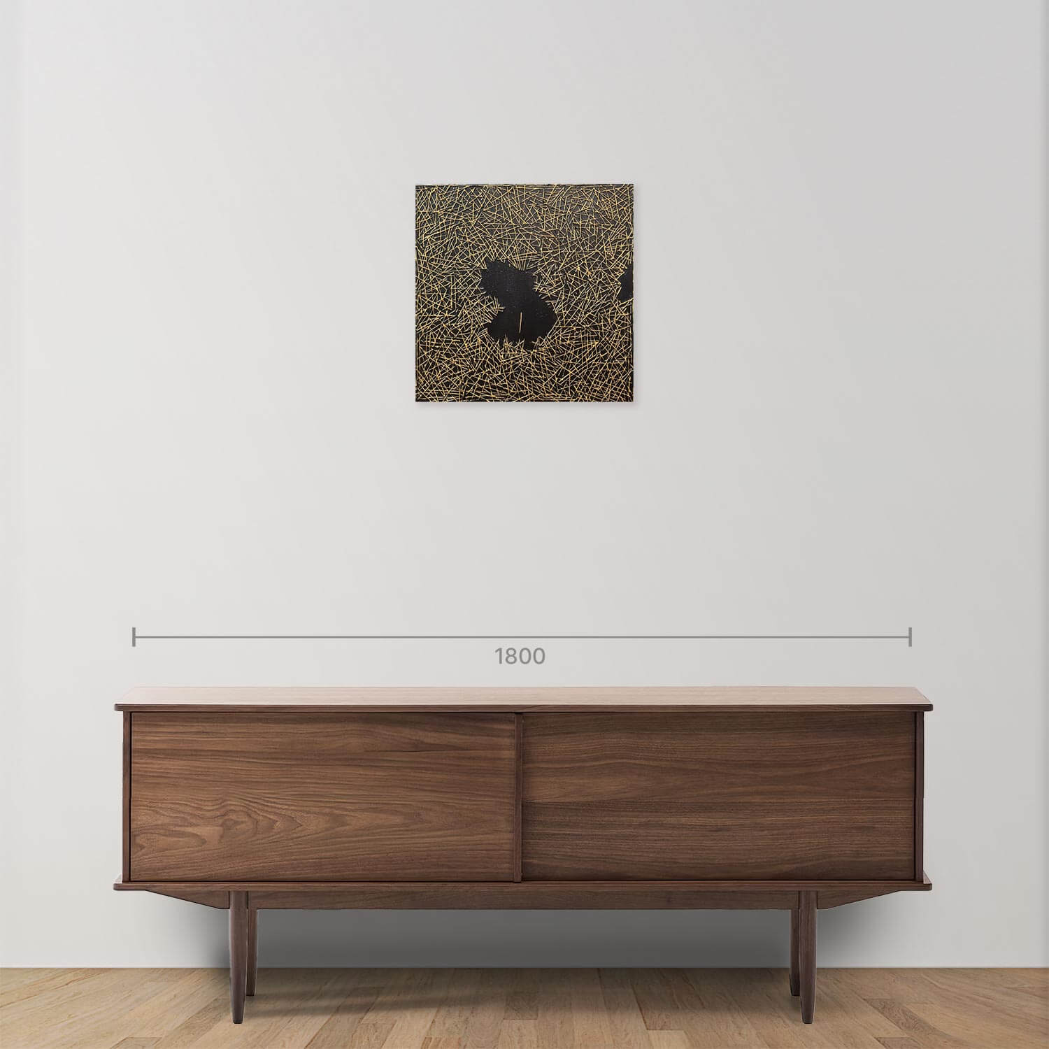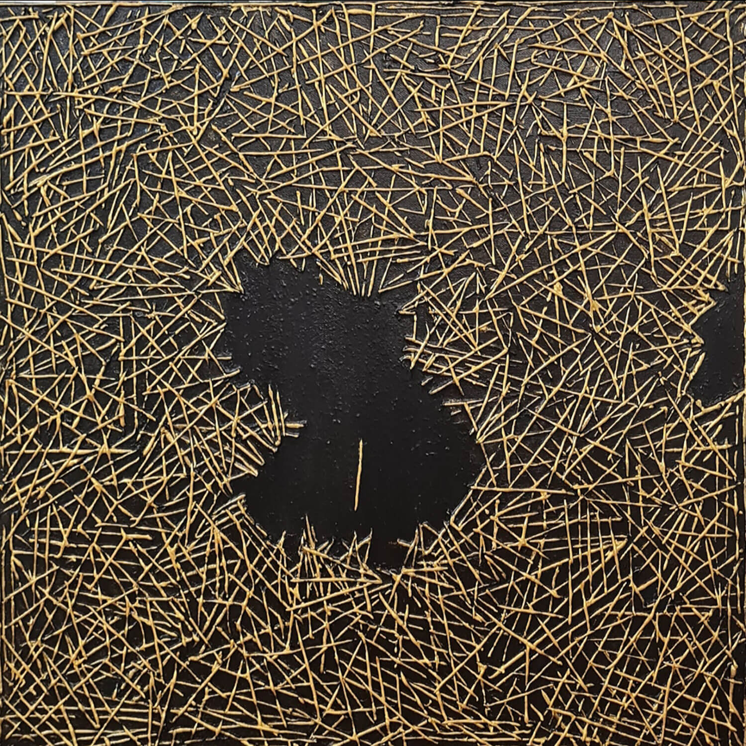A black background surface is invaded by a network of raised golden segments, expressing emotional confusion. Created with black acrylic and a mortar grid enhanced by golden acrylic.